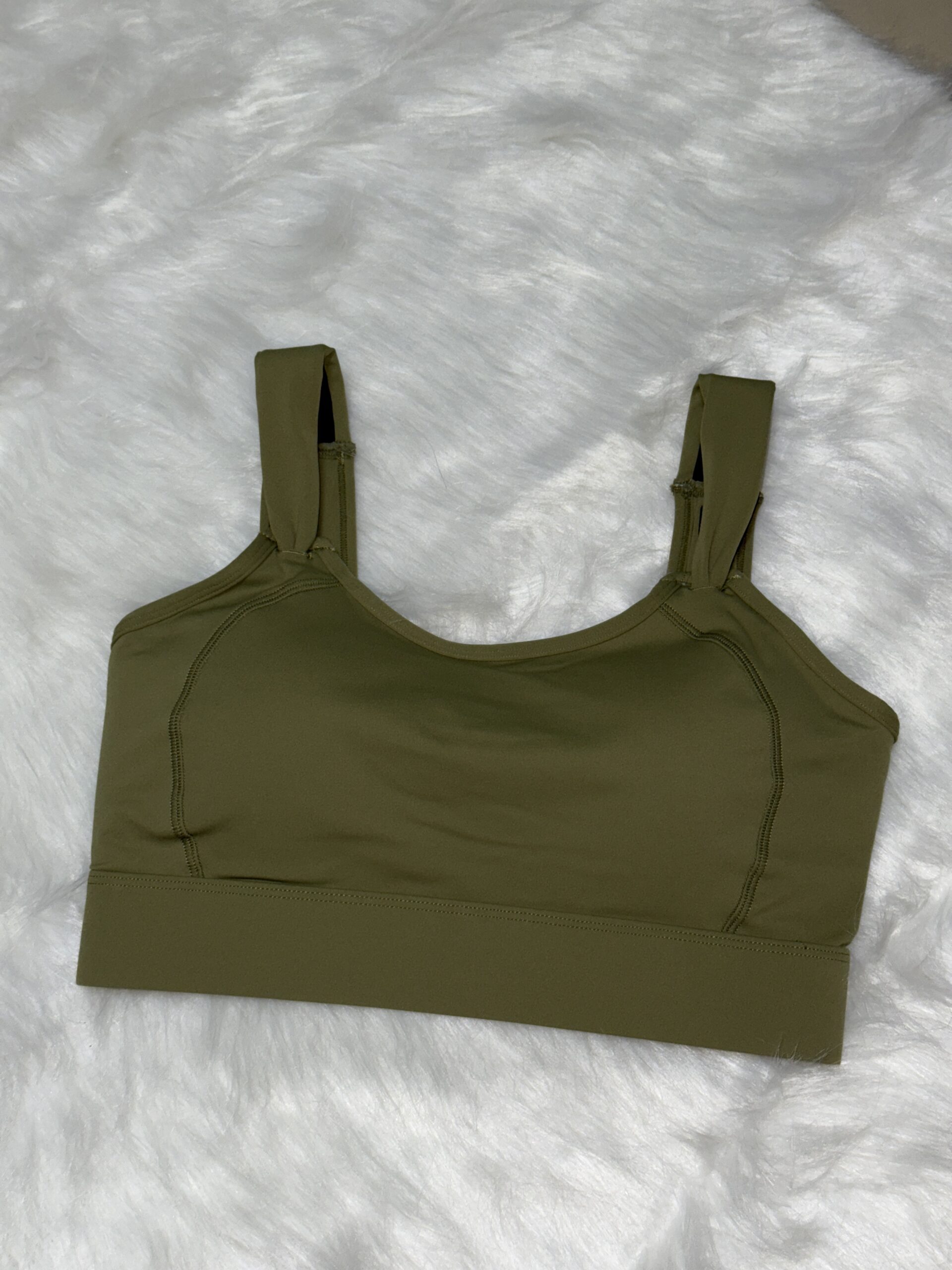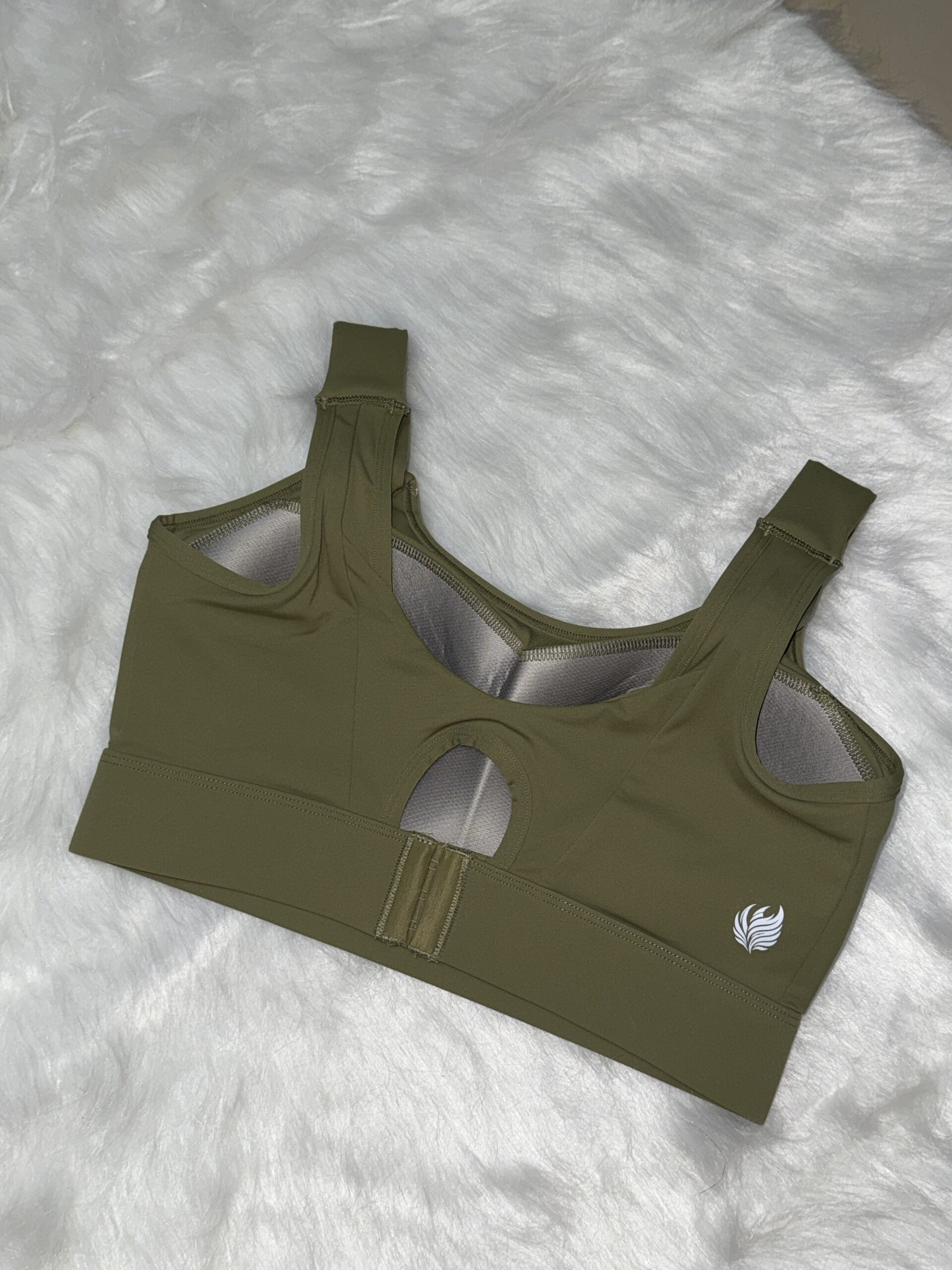 A stylish and supportive bra in a beautiful olive green. This top features structured seams on the front to give a flattering shape and extra support. The deep U-back and small keyhole cutout add a feminine touch while keeping the design functional.